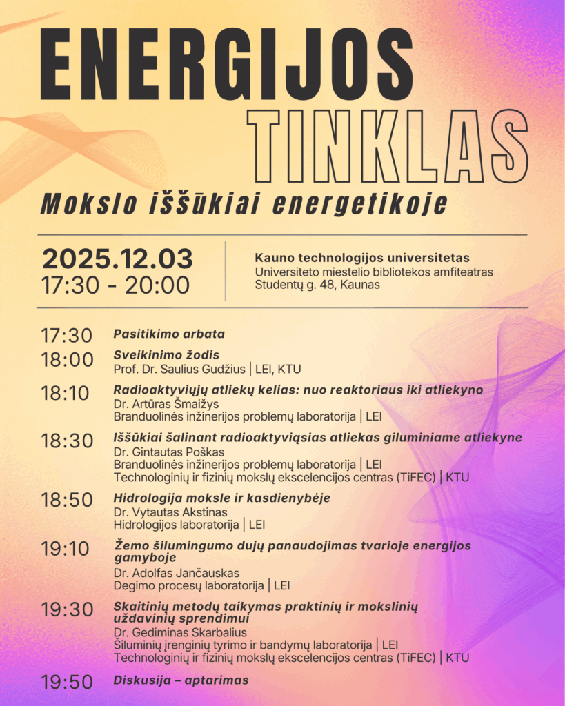 Maloniai kviečiame Jus į renginį „Mokslo iššūkiai energetikoje“, kuris vyks 2025 m. gruodžio 3 d. (trečiadienį) 18 val. Kauno technologijos universiteto bibliotekos amfiteatre, adresu Studentų g. 48, Kaunas.