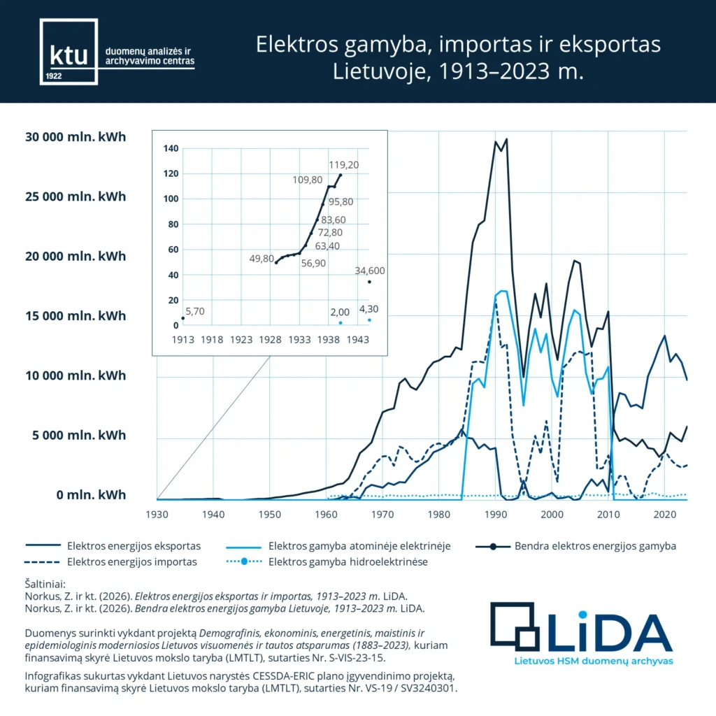 Per pastarąjį šimtmetį Lietuvos energetikos sistema smarkiai pakito – nuo vietinių mažų elektrinių tarpukariu iki šiuolaikinės, į Europos tinklus sinchronizuotos sistemos, kaip atskleidžia KTU Lietuvos humanitarinių ir socialinių mokslų duomenų archyve (LiDA) saugomi istoriniai duomenys.