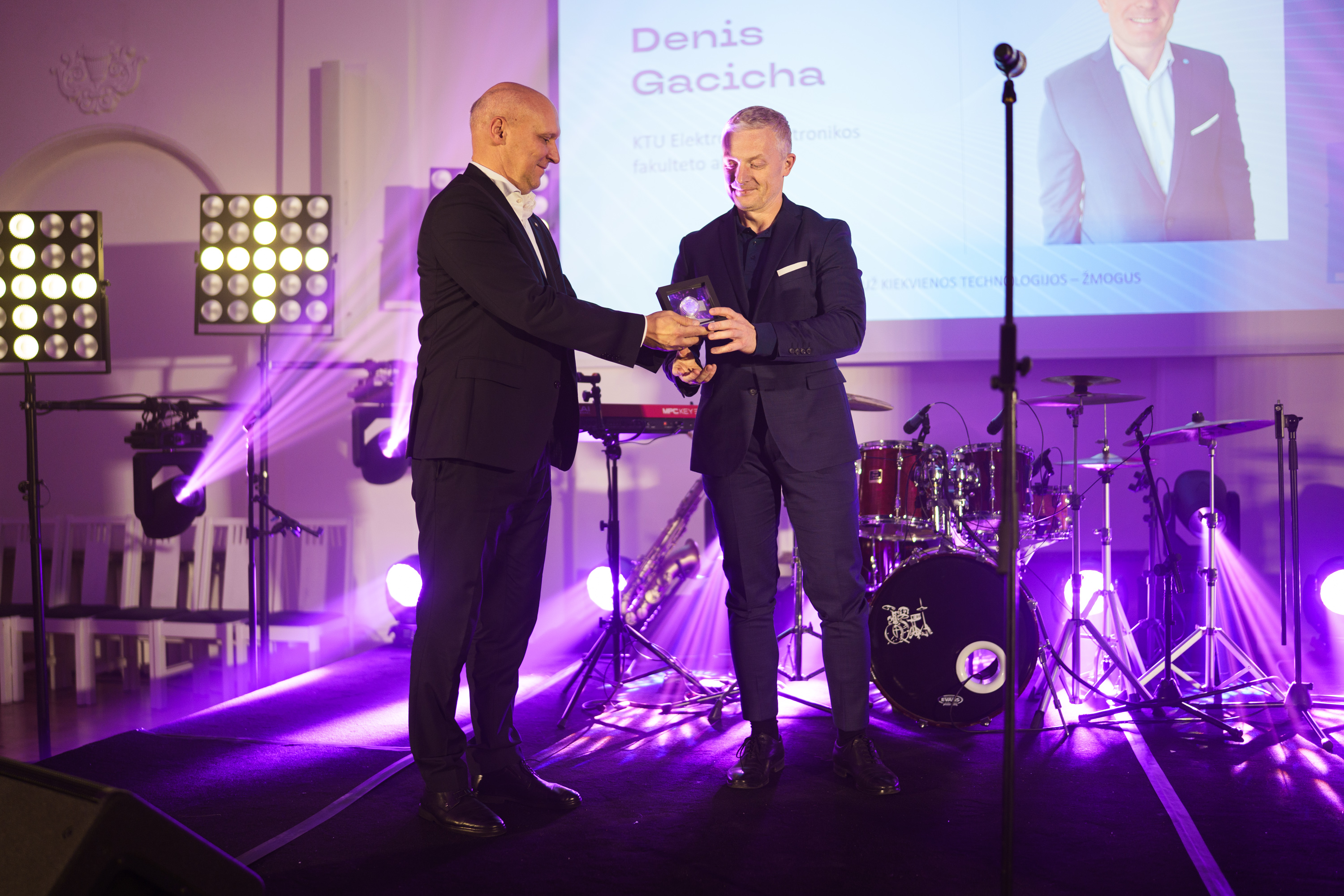 KTU Elektros ir elektronikos fakulteto (EEF) dekanas prof. dr. Mindaugas Žilys išskirtinę sidabrinę sėkmės monetą – Lietuvos monetų kalyklos ir KTU bendrą kūrinį – įteikė EEF alumnui, tarptautinės technologijų milžinės „Schneider Electric“ vadovui Baltijos regionui Deniui Gacichai.
